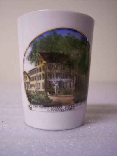 White cup with straight, flaring sides. No handle. Transfer print of "The Phelps Tavern, Established 1782, Litchfield, Conn" and color transfer print of said building centered on one side. Color image is framed in gilt. Bottom of cup states "Imported by E, L, Phelps, Litchfield, Conn. Made in Germany."