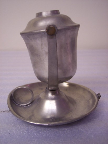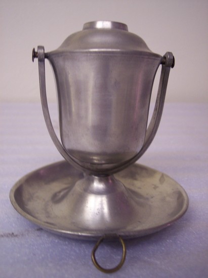 Saucer base with soldered grooved round thumbpiece in saucer. Brass ring opposite attached by strap of pewter. U-shaped holders with round heads and holes for copper pins to hold deep acorn-shaped tank. Intended to be either carried in the hand like a candle or to hang on the wall like a sconce, the saucer then becoming the reflector.