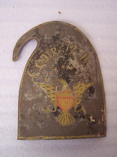 Piece of tin cut in shape of liberty cap and curved. Japanned and painted with yellow borders. American eagle spread with seven stars above it. Eagle has red shield on breast and stars have red stars over yellow ones. Unit number worn off "Compy 17th Regt" Except for Regimental number, identical to ca1898-02-0