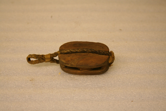 Wooden block and pulley in rectangular/oval shape with 1 1/4" diameter grooved wheel inside. Rope woven around outside of block and tied in a loop on one end