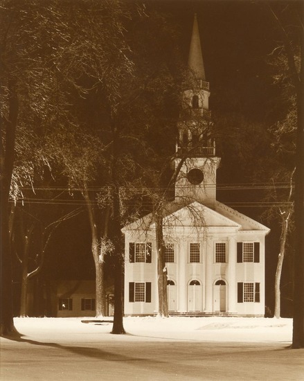Black and white photograph of Congregational Church in Litchfield at night. Ground is snow covered. Photographer standing in Green to take image. Church slightly off center to right in photo. Framed under glass.