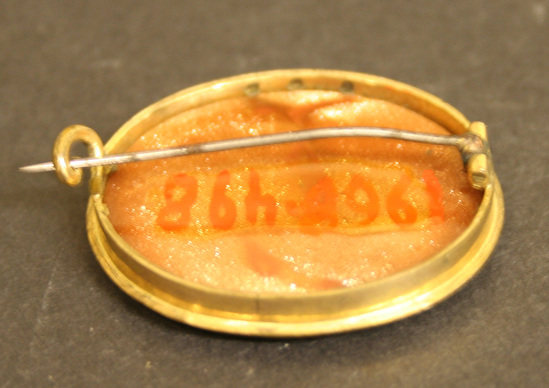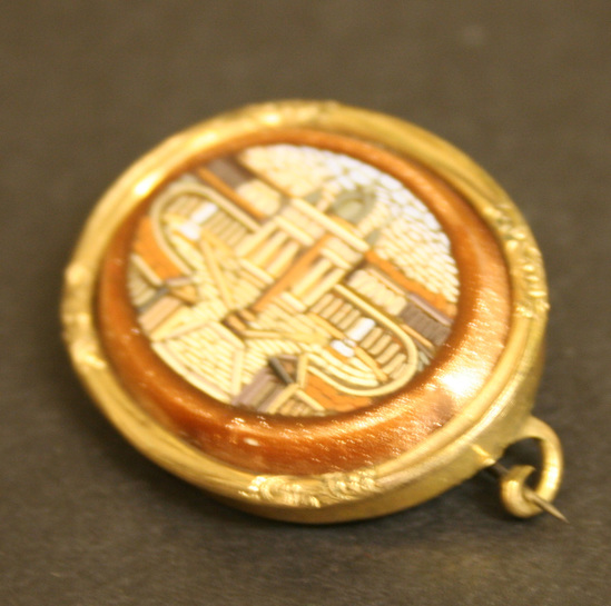 Oval brooch with horizontal pin on back. Colored mosaics set in oval "goldstone" with gold frame. Mosaics create scene of columns in front of St. Peter's in Rome, Italy.
