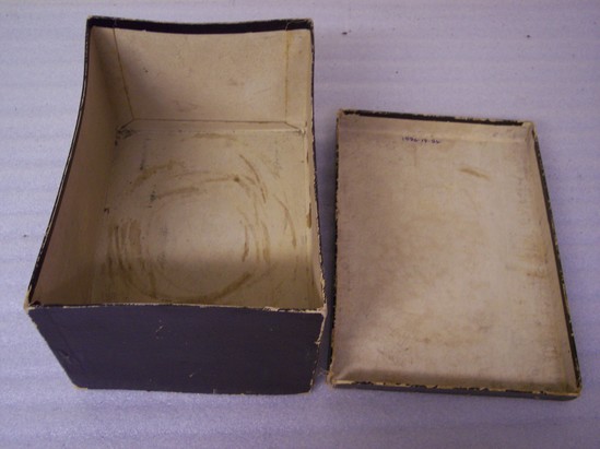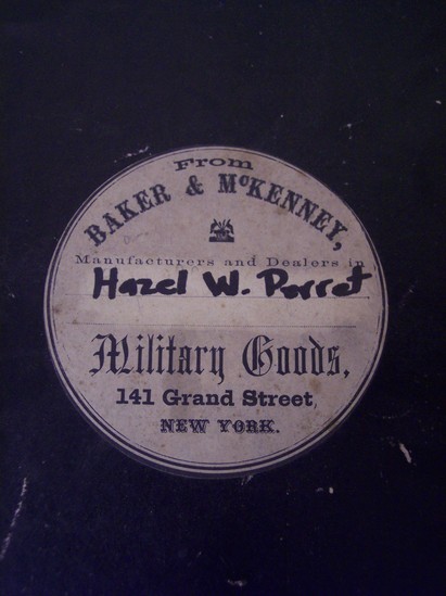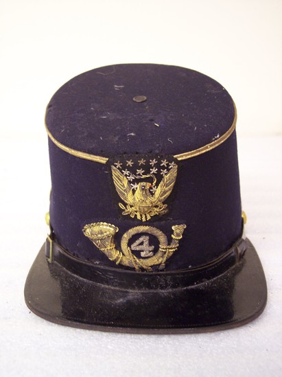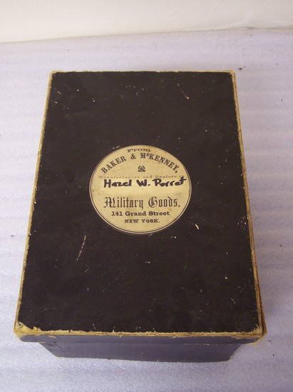 A: step forward cap with short leather black brim, blue wool over cardboard top with gilt piping, front strap with "CNG" side buttons, horn with 4 in center in gilt braid and sequins, above it eagle with stars in silver (eagle in gold) black interior with markings in gold. Label on inside of cap "Baker & McKenney/ Military Goods/-141-/Grand Steet/New York" B: black cardboard, square shaped hat box. Paper label on lid of box, round, "Baker & McKenney/ Military Goods/-141-/Grand Steet/New York"