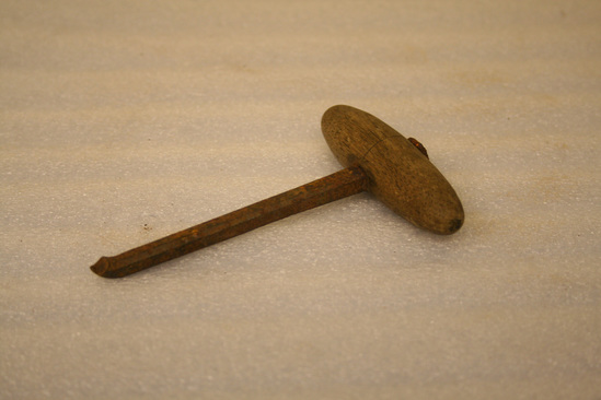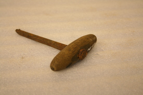 Iron spike. Slightly curved at end. Oval shaped handle, wood, at top of spike perpendicular to spike