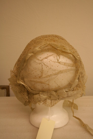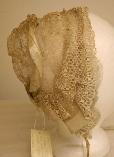 Bonnet shaped hat made of white netting with two strips of white lace around trim; white satin ribbon around top with bow at base; white satin ribbon near front on right side and whtie satin ties; white netting ruffled brim on both sides