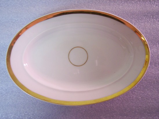 Oval serving dish with wide gilt band on edge. Small, thin gilt circle in the center.