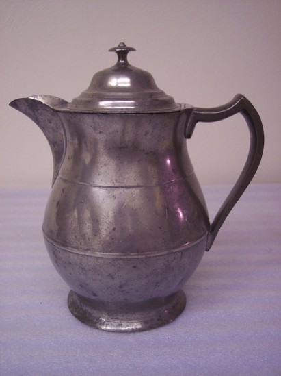 Tulip shaped body with rim foot, doomed top with button finial. Hollow handle 1/2 pierced filter in spout, 3 quart size. Marks on bottom or crouching lion and "BOARDMAN" in ribbon