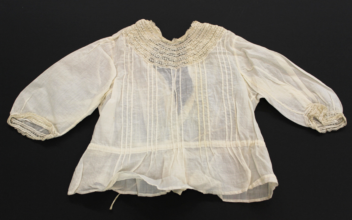 White sheer cotton child's bodice; long gathered sleeves with lace edge; lace round yoke; tucks at front and back; center back opening with four buttons; casing and tie string gathering at waist; hand-stitched
