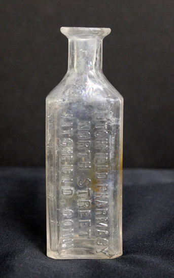 Small rectangular clear, glass bottle with short neck and round mouth. "LITCHFIELD PHARMACY/ NORTH STREET/ LITCHFIELD, CONN." impressed on one side. "3 m" impressed just below neck with measurement numbers and tick marks impressed along side of bottle.