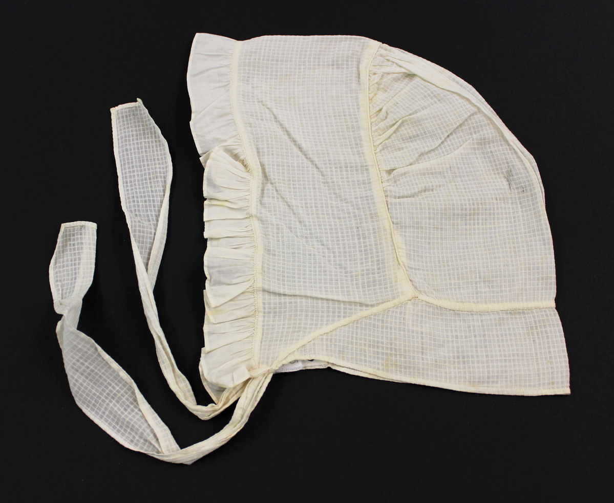 Off-white sheer checked child's bonnet; gathered back section; ruffle along front; drawstrings at right side; fabric ties