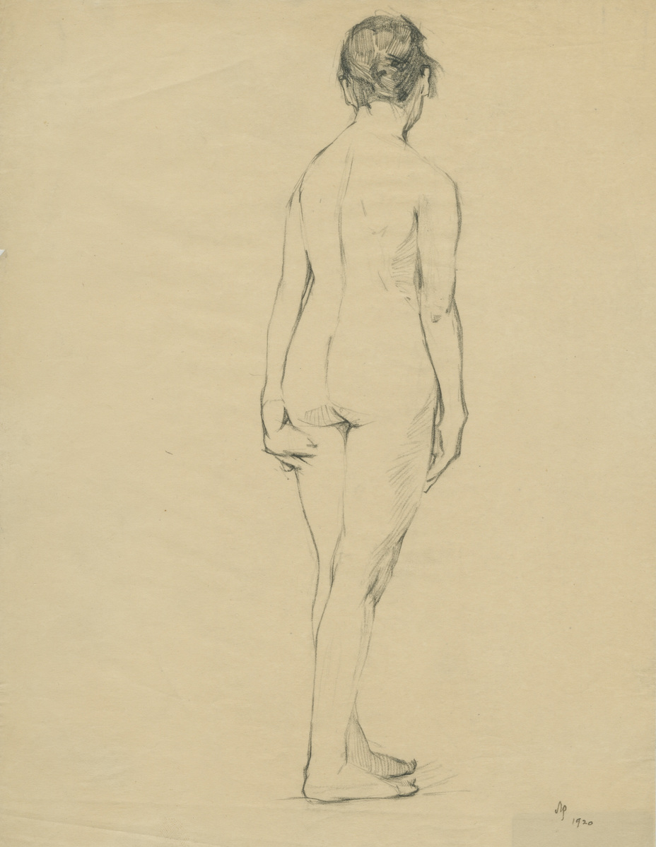 Pencil sketch on paper. Central figure is a nude woman drawn from behind with her hair up. Her right hand is resting on the front of her left leg while her left hand is resting on the back of her left leg. Her legs are partly crossed and her left foot is facing forward from her front while her right foot is pointed off to the right. Initialed and date in ink on the bottom right hand corner.