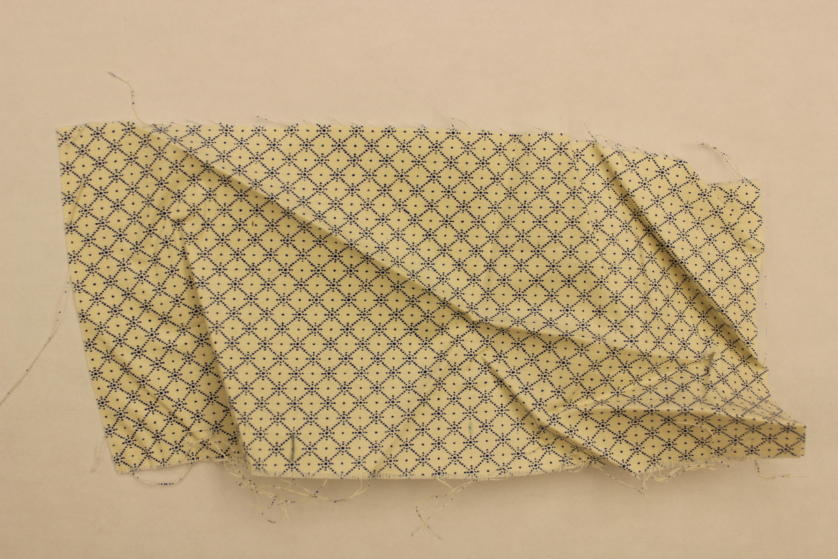 Rectangular fabric swatch made of synthetic material. White with a continuous blue diamond pattern. At the corner of each diamond is a four-pointed star. In the center of each diamond is a blue dot. The entire pattern is made up of small blue dots. Fabric is smooth to the touch.