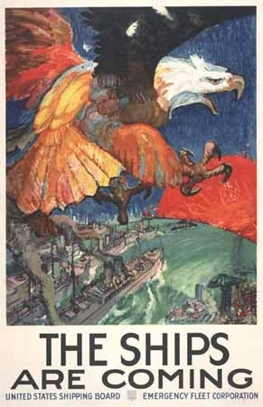 World War I era poster. Multi-color image of large bald eagle flying over a group of ships. "THE SHIPS/ ARE COMING/ UNITED STATES SHIPPING BOARD EMERGENCY FLEET CORPORATION" in black letters across bottom of poster.