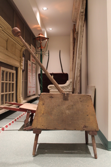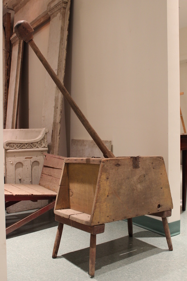 Wooden box on short legs. Two paddles inside box with holes cut throughout. Long wooden handle in center with third paddle attached that can be pushed back and forth.