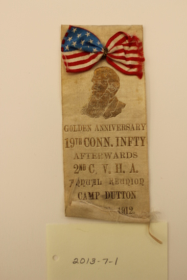 Ivory silk G.A.R. golden anniversary ribbon with American flag at top with metallic ribbon at center to create a bow. Printed in gold on the ribbon is a three-quarter profile of Dr. B.F. Stephenson, founder of the G.A.R., followed by "GOLDEN ANNIVERSARY / 19TH CONN. INFTY / AFTERWARDS / 2ND C.V.H.A. / ANNUAL REUNION / CAMP DUTTON / SEPT. 11, 1912." Slits were made at the bottom of the ribbon. Top of ribbon is folded over to back and a long stick pin secured. Sticker paper label on back.