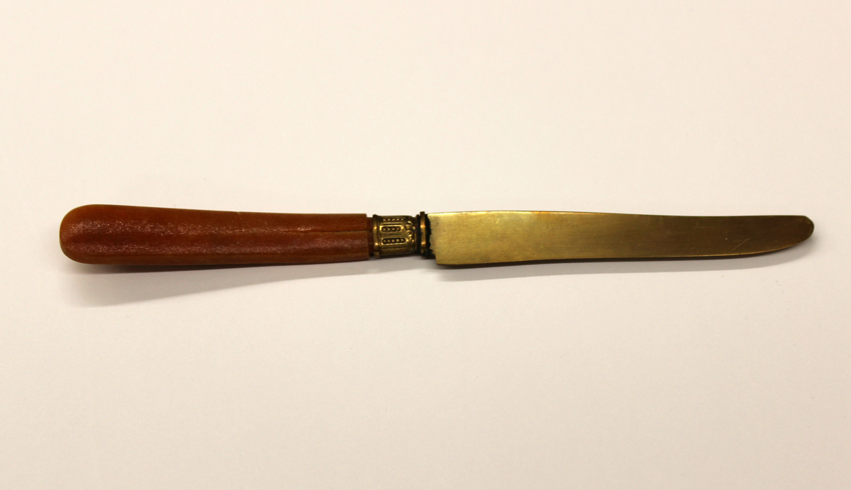 Small table knife with rounded Bakelite handle and slightly-curved blade. Metal bolster with carved decoration of rows of small beads and floral designs at the top.