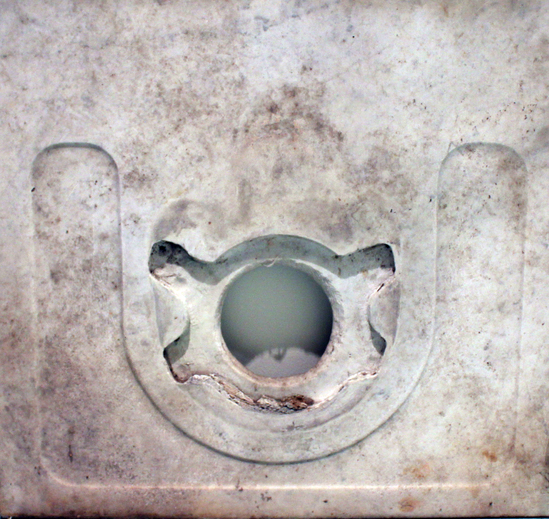 Square marble tile. Possibly as an insert on a wall. Light gray stone. Carved into stone along bottom and sides is a "U" shaped impression. Inside the bell of the "U" is but a hole five inches in diameter. Scalloped design carved out around circular hole. "N. 2" carved into stone above hole.