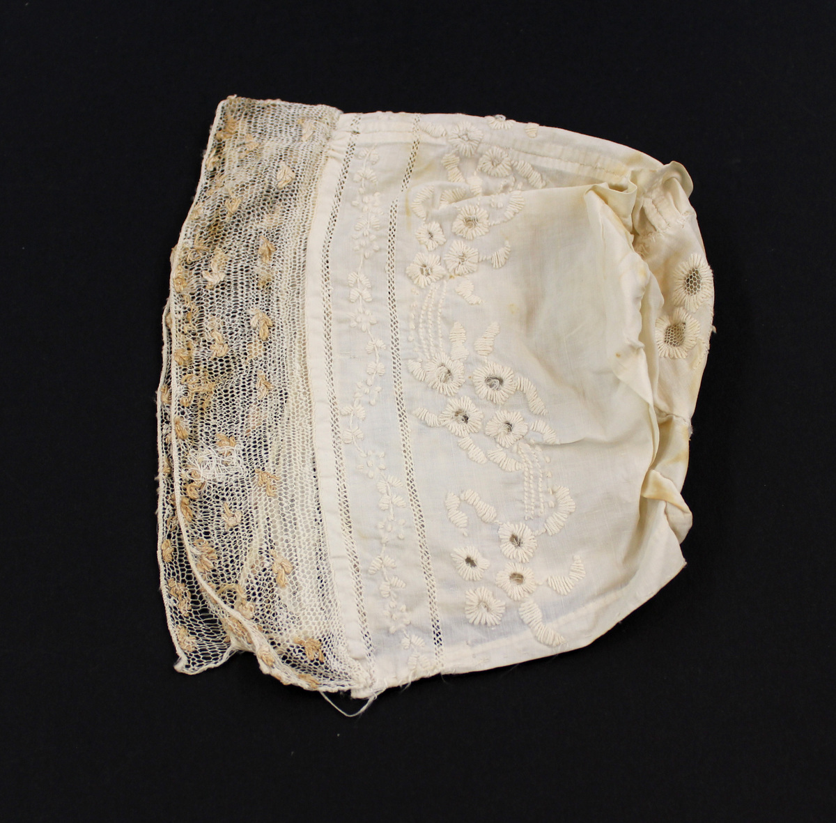 Off-white cotton child's bonnet; white work embroidery with needle fillings at front and at gathered back section; embroidered net lace at front; ruffle at back; drawstrings at front sides
