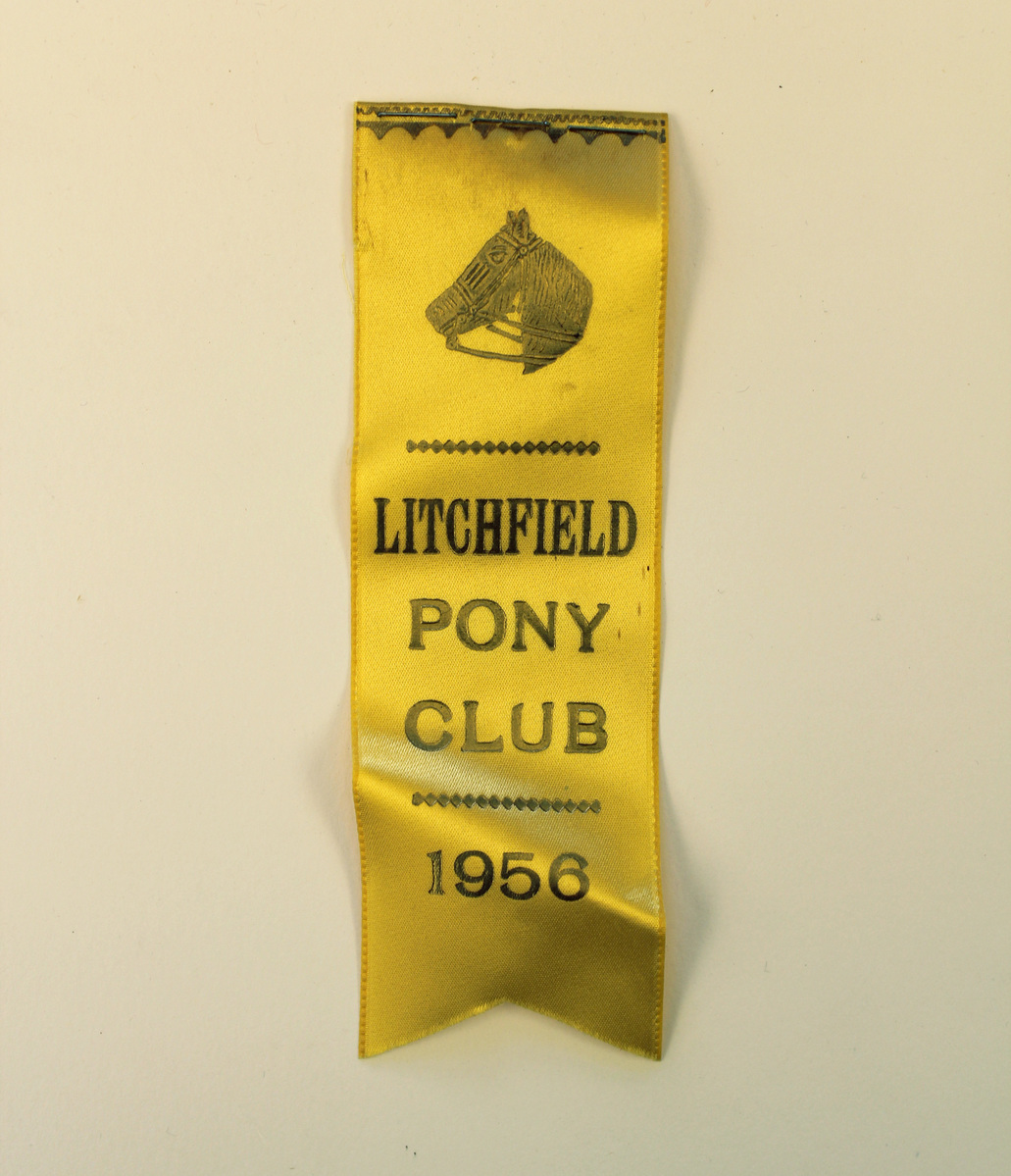 Rectangular ribbon of yellow satin, square at the top and notched at the bottom. Printed on one side in gold ink is an image of a horse's head with lettering, "LITCHFIELD/PONY/CLUB/1956." Top edge folded over and stapled.