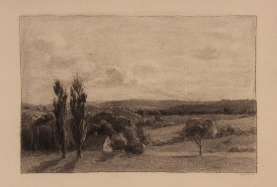 Sketch of a landscape executed in charcoal. House surrounded by dense trees on left. A single tree on right. Hills in background with a large clouded sky. "CAHILL" signed in pencil below lower right corner.