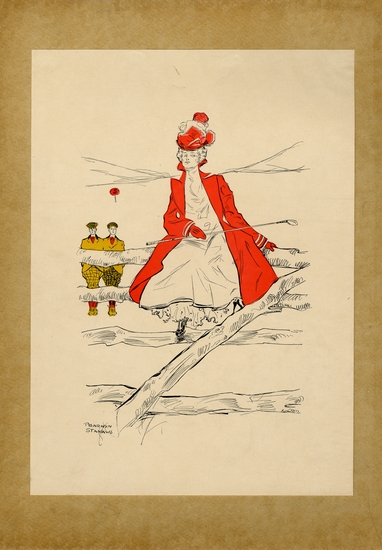 Print on white paper. Paper mounted on board. Image of a woman sitting on a wooden fence holding a golf club and wearing a long cat and hat. Two men in gold attire in background.