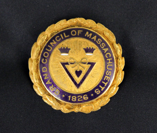 Circular Masonic pin. Outer edge cast in shape of a laurel wreath. Center portion has purple enamel border with "GRAND COUNCIL OF MASSACHUSETTS - 1826" in gold. Center of pin decorated with purple enamel triangle with purple heart in the middle. Two purple crowns above triangle. "MADE BY / F.I. GORTON CO. / NO. ATTLEBORO / MASS." stamped on back.