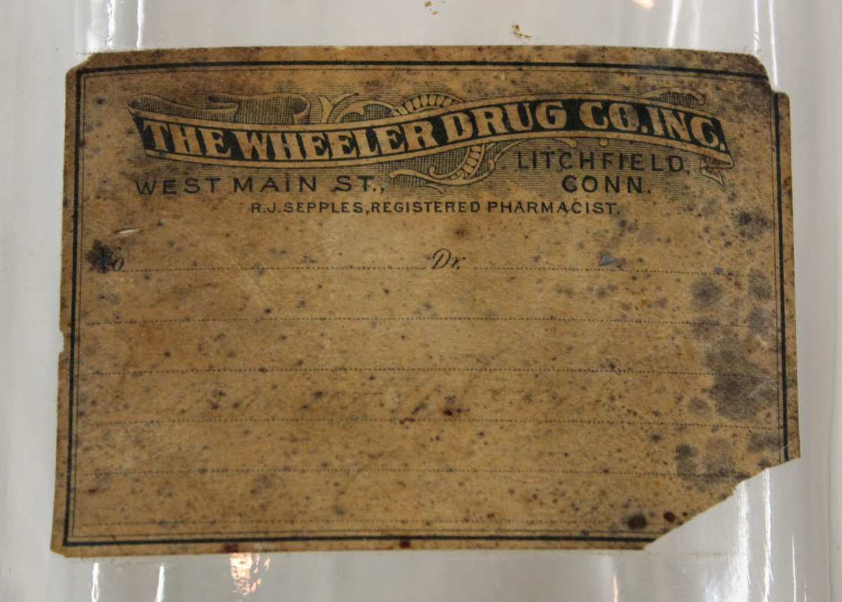 Pressed glass medicine bottle. Wide, rounded shoulders; short neck, slight rim, and narrow opening for a cork stopper. Bottle is wide, but narrow in depth. Embossed lettering on one side, under neck, "ONE PINT." Paper label affixed on opposite side. Label reads "THE WHEELER DRUG CO. INC." set in black banner, with black text underneath, "WEST MAIN ST., LITCHFIELD/CONN./R.J. SEPPLES, REGISTERED PHARMACIST" with lines underneath for doctor and prescription information.