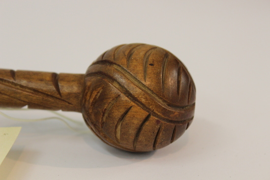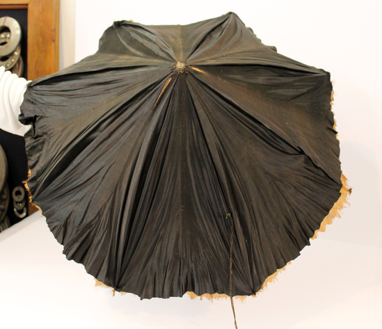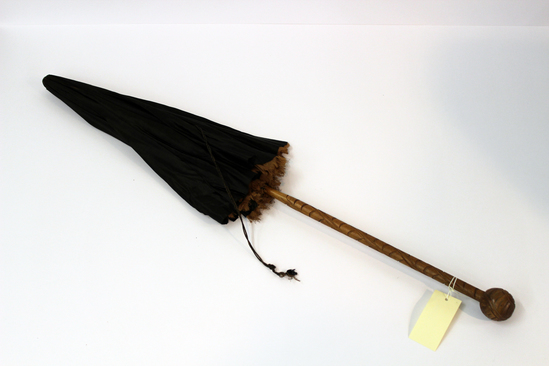 Parasol; brown silk lining with pinked scalloped edges and black silk overlay with cut scalloped edge; carved wooden stick with knob at base of handle; black cording to wrap around parasol to hold closed