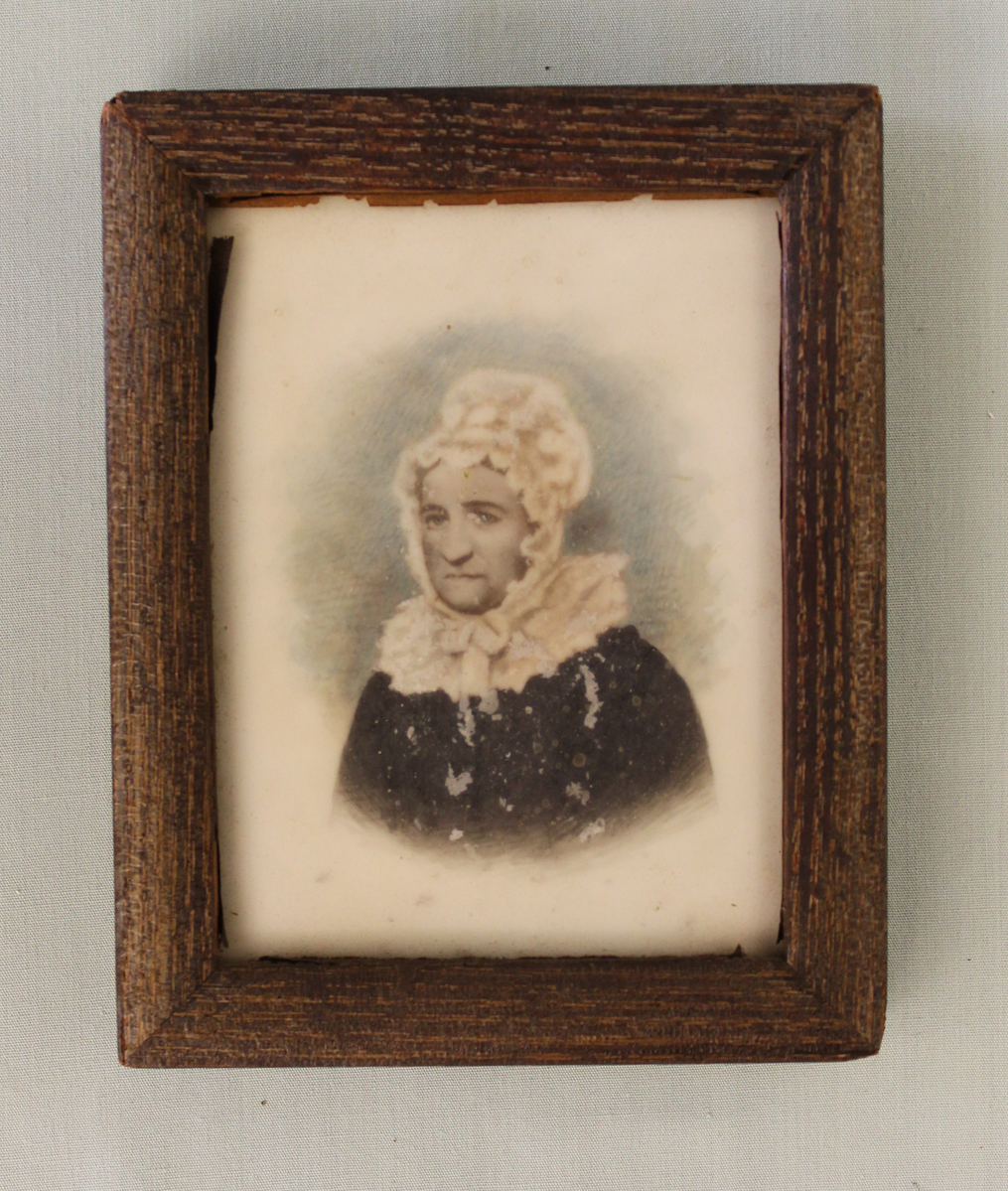 Watercolor portrait miniature of an older woman from the bust up. Sitter is seen wearing a cap, dark dress, and ruffled collar. Miniature framed under glass. A handwritten note is pasted to the back that reads "Elizabeth Stockwell/ Collier - wife/ of Thomas Collier/ From a portrait in Philadelphia".