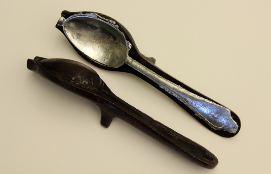 Large brass spoon mold in two parts. Opening at end of bowl to pour pewter. Pewter spoon inside mold - uneven ends, not filed down.