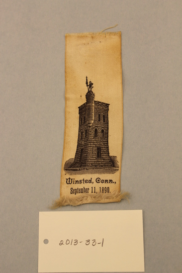 G.A.R. Civil War memorial ribbon. Ivory silk with fringe edges at top and bottom. Printing on ribbon is a three-quarter view of the Civil War Memorial in Winsted, Connecticut. Printed below: "Winsted, Conn., / September 11, 1890." Mark stamped in oval on back of ribbon.