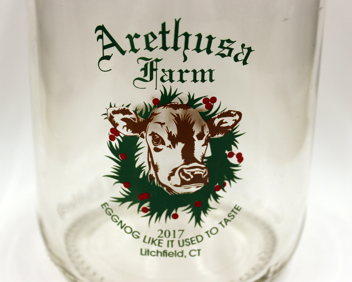 Three-part mold glass milk bottle (a) with red plastic cap (b). Cow head printed in brown on front of bottle, with green wreath with holly berries printed around cow. "Arethusa/Farm" printed in green above wreath; "2017/EGGNOG LIKE IT USED TO TASTE/Litchfield, CT" printed in green below wreath. Raised lettering around bottom edge, "32 FL. OZ. (946ml)/13" with series of raised dots; "STANPAC" in raised lettering on bottom. UPC code printed in brown on back of bottle.