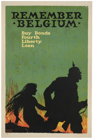 World War I poster. Green poster with fire depicted at the bottom. Black profile silhouette of a German soldier pulling a young girl behind him seen in center. Poster reads, "REMEMBER/ BELGIUM/ Buy Bonds/ Fourth/ Liberty/ Loan."