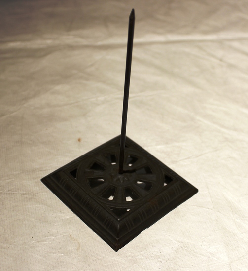 metal desk spike/paper spindle. Thin metal spike extending vertically from square cast metal base with simple wheel or circular decoration with eight spokes. Groups of three vertical incisions evenly spread around the perimeter of base.