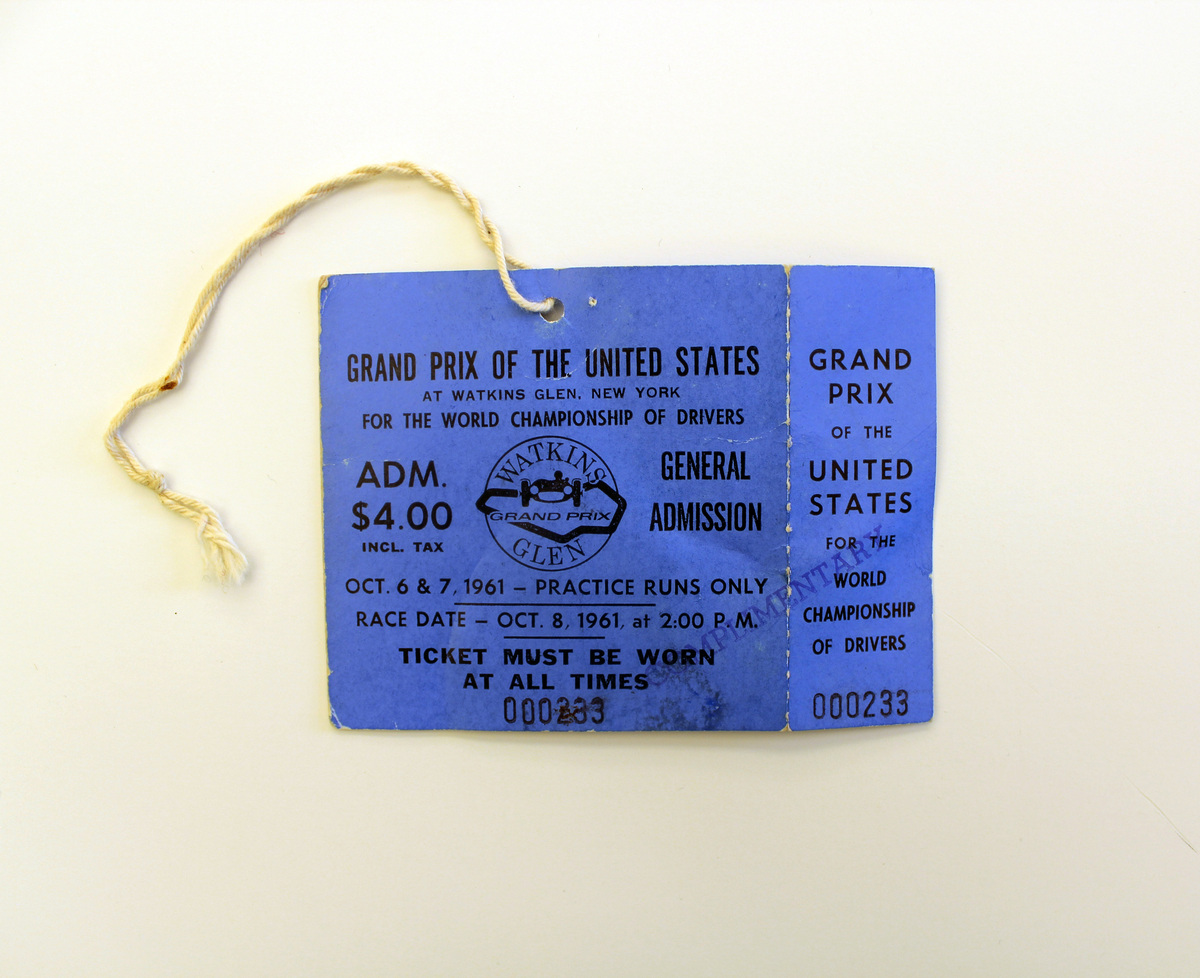 Printed general admission pass for the Grand Prix of the United States. Blue cardstock with printed black lettering on both sides. Logo for Watkins Glen International race track with information about timing for the race and practice runs (October 6-8); admission price; ticket number; and spectator warning. Hole punched at top with white string tied in loop.
