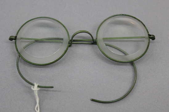 Eyeglasses (a) with thick, circular lenses and green metal frame with "w" bridge and curl temple bars with no finials. Lenses taper from back to front, starting at 1.75" in diameter and ending at 1.375" in diameter. Oblong eyeglass case (b) with hinged front, covered in embossed faux leather with an interior of blue synthetic velvet. Case is stamped "Staples Inc./356 Alder/Portland, Ore." on inside flap.