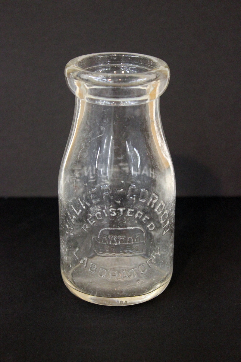 Glass milk bottle with round lip top, circular bottom, and tapered sides. Half pint. Embossed lettering on front, "WALKER-GORDON/LABORATORY/REGISTERED" with image of milk bottles in a carrier. Embossed lettering on back, "MASS/SEAL/T, HALF PINT" and "MTG" on bottom. Impressed circle on bottom with illegible lettering in center.