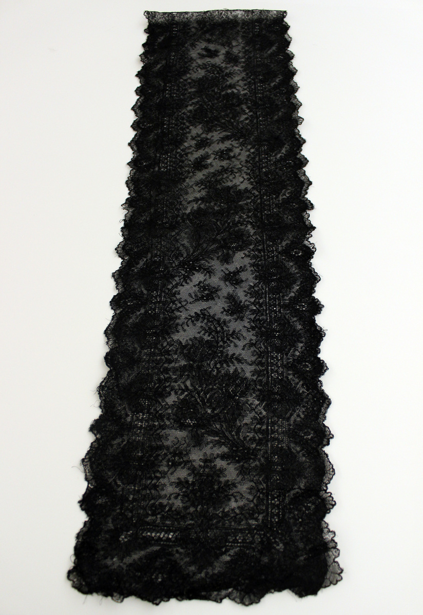 Black Chantilly lace mourning veil. Rectangular veil, all lace with scalloped edges.