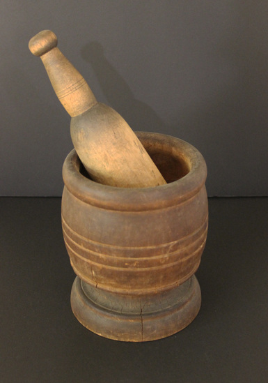 Wooden mortar and pestle. Mortar sits on wide foot. body is wide with carved out center and thick lip. Slight turnings at the top of foot and bottom of body. Three incised lines around center of body. Pestle has short handle and a long, thick tubular end.