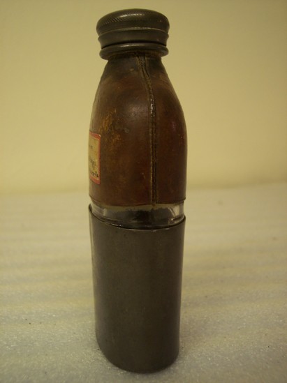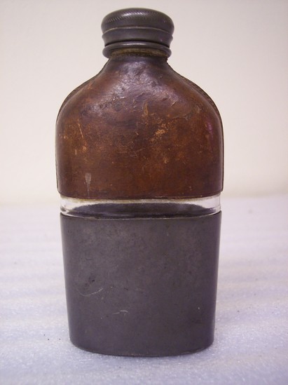 Glass bottle - bottom half covered in metal. Top half covered in leather. In between two sections is thin band of glass. Metal screw cap on top. Sticker attached to one side of bottle reads "Flask found on Col. E.S. Kellogg's body Cold Harbor, VA"