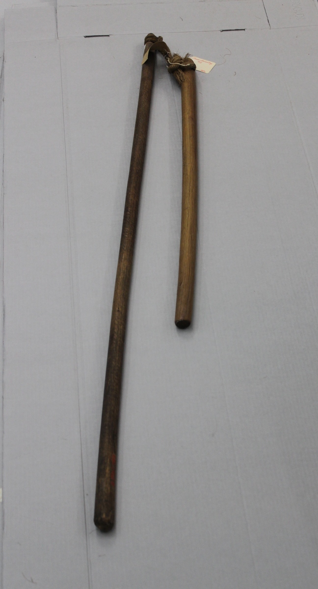 Two-piece flail, consisting of two wooden rods, one longer than the other. Both have holes at top and are joined together by thick rope.