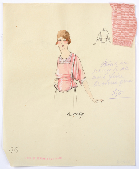 Lithograph and watercolor on paper fashion design. Silk jersey blouse with delicate gray embroidery. Fabric samples accompany rendering.