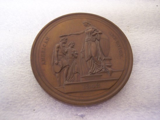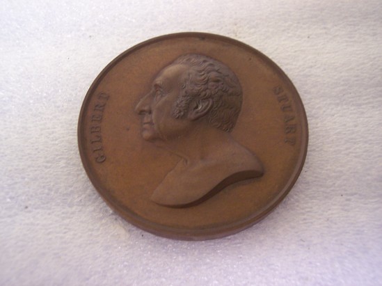 A: Round bronze Art Union medal honoring Gilbert Stuart. Front side has left facing profile of artist with inscription "GILBERT STUART" and back side depicts two artists on steps being crowned by a woman with shield; inscription reads "AMERICAN ART - UNION 1848" B: Leather box with red cover and red velvet lining