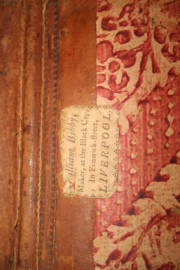 Black tri-fold wallet with two interior pockets. Upper pocket accordian style with extra pocket on inside. Lower pocket is the same. Interior pockets are made of brown leather. Book of paper decorated with marbelized paper cover. Exterior of wallet decorated with repeated tooled leather design. Wallet closes with leather strap. Paper maker's label "William Bibby/Maker, at the Black Cap/in Fenwick Street/Liverpool"
