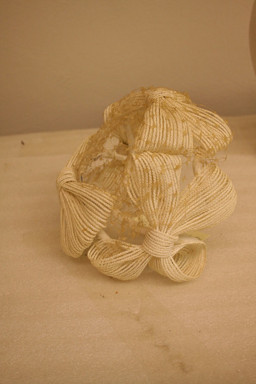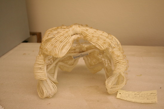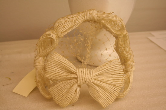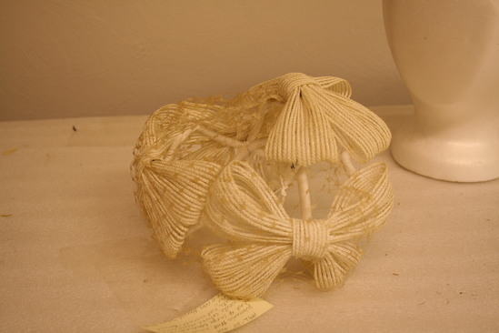 White velvet covered wire frame in oval shape; four large white bows attached to from around brim; white netting over front three bows; label "Bonwit Teller"