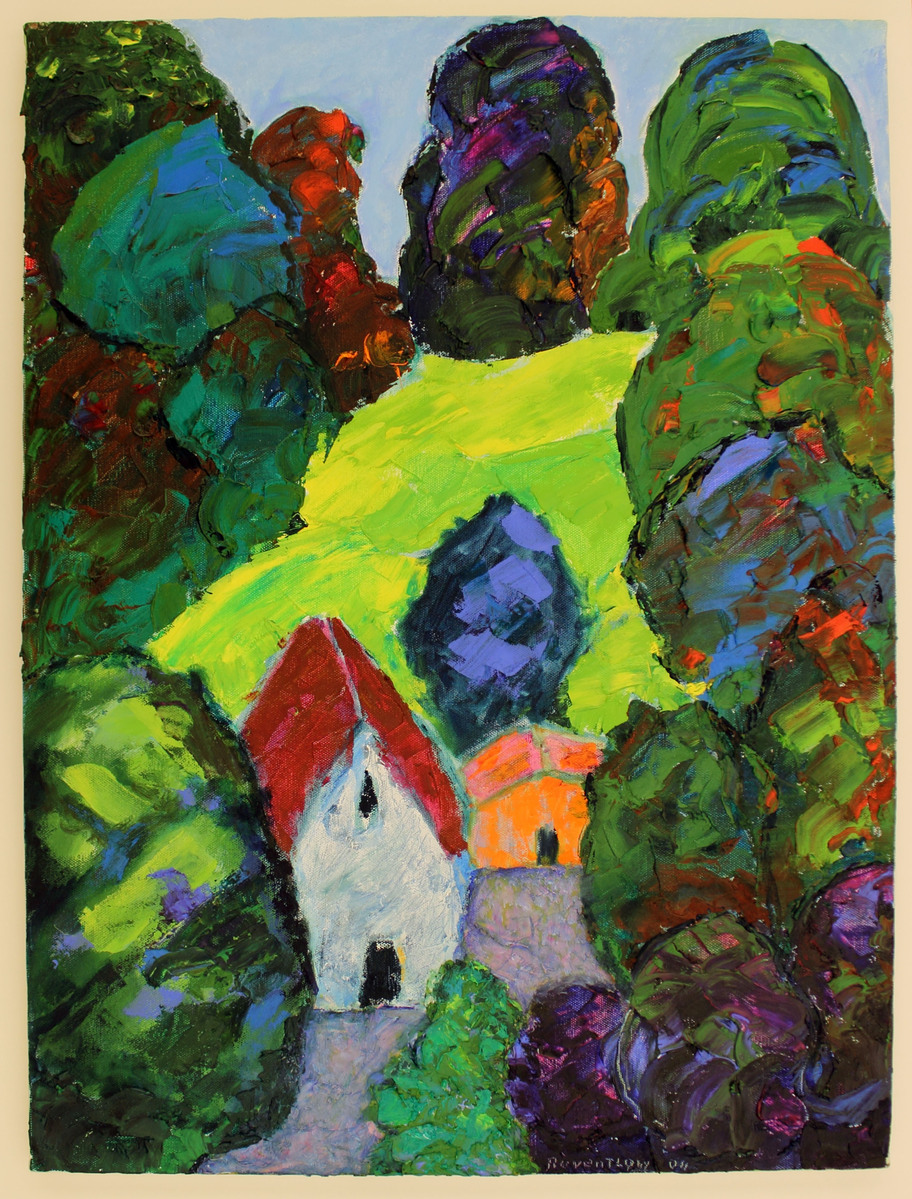 Oil on canvas painting of an abstract landscape, completed in an impasto style. Round trees in green, blue, and purple surround a white building with a red roof and a smaller orange building. Green field behind, possible with a small pond. Signed in lower-right, "Reventlow/04." Unframed canvas.