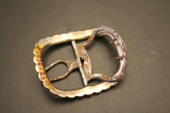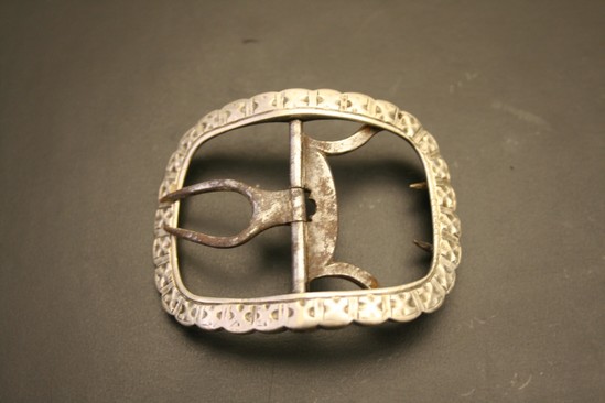 Pair of oval shoe buckles. Scalloped border around outside edge of buckle with "X" impressed into center of each scallop. Vertical shank in center with fork side buckle and rounded closed buckle with two small teeth.