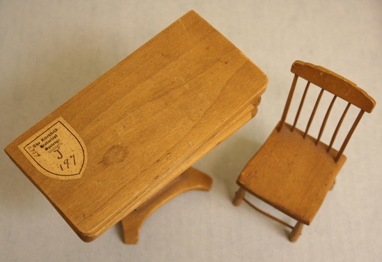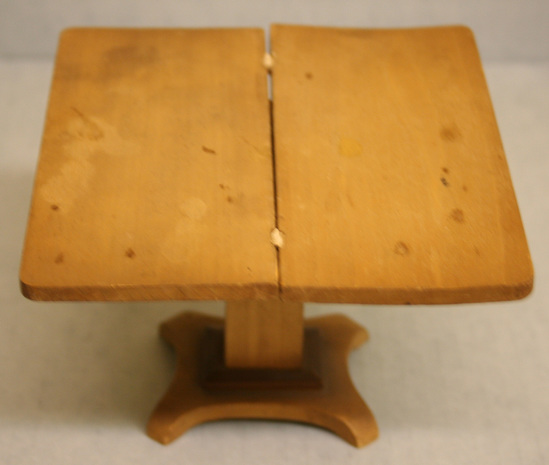 A - Table - 4" high x 2 1/2" wide x 5 1/4" deep - Wood center pedestal table, flip top B - Side chair - 4" high x 2" wide x 2" deep. Four legs form stretcher, square seat, four spindles and two posts back, step crest.