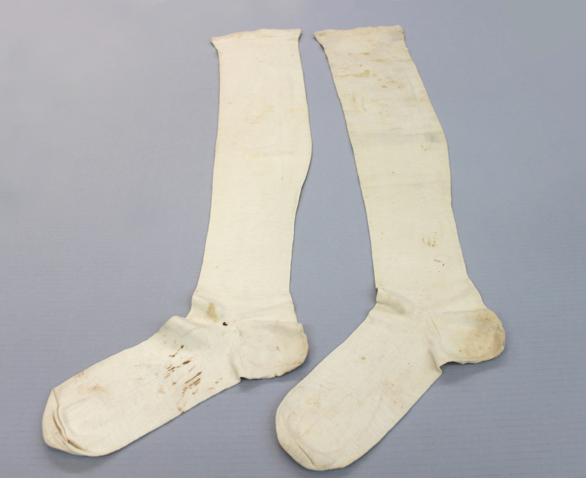 Off-white cotton knit men's stockings. Center back and foot seams. Punched marks on top of hems: "P4"