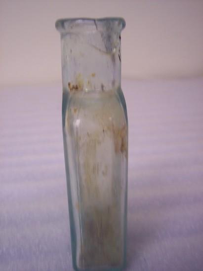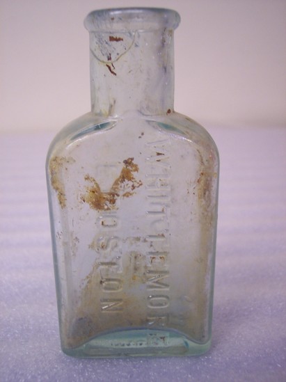 Blue/green glass bottle with raised lettering on one side "Whittemore/Boston" and "French Glass" on the reverse. Cork missing